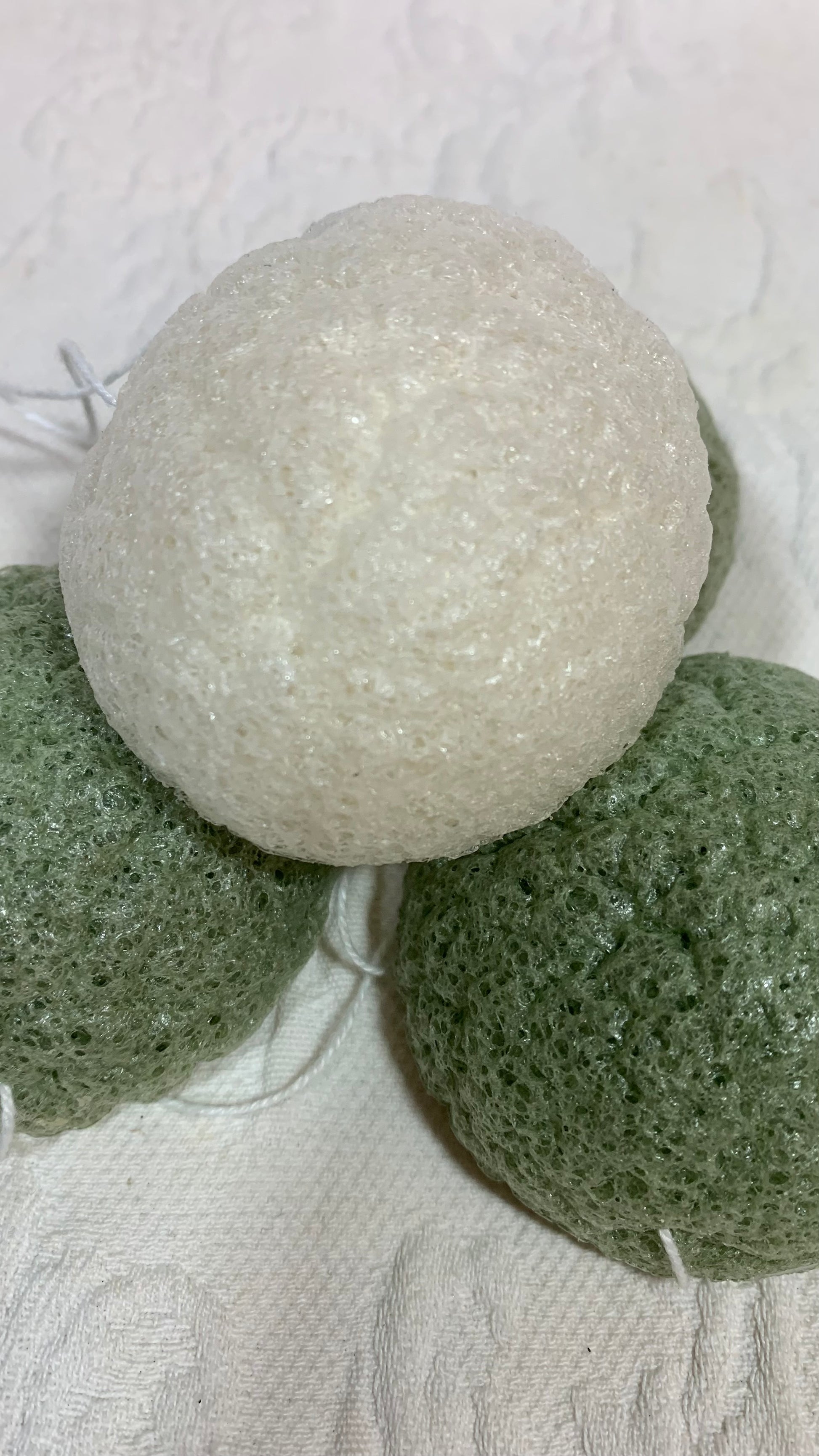 Eponge konjac 100% végétale, confectionnée à partir des racines de la plante asiatique du même nom.