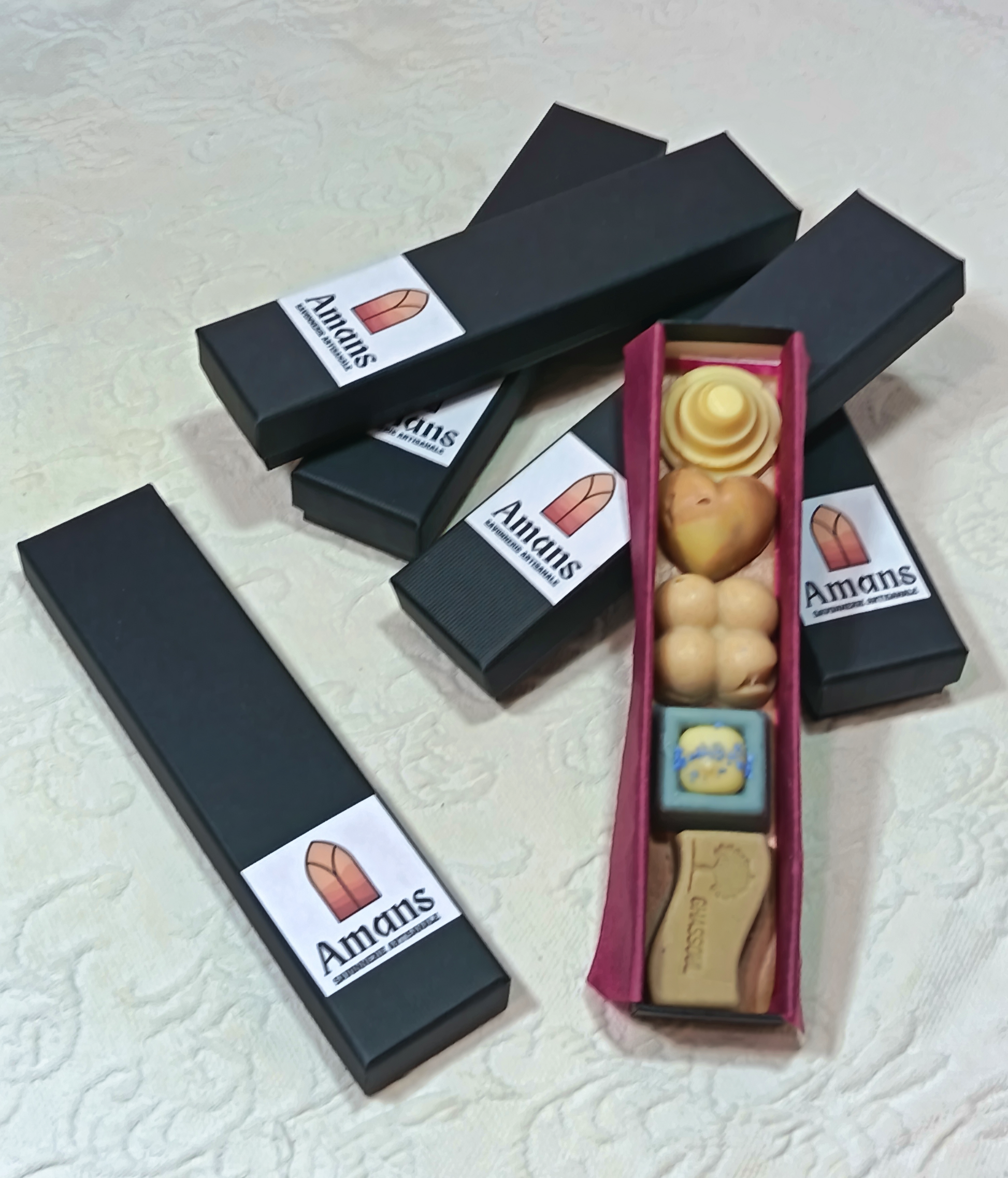 Chaque écrin est composé de 5 savons d'invités: 1 savon nature au karité, 1 savon argile rose, 1 savon argile bleue, 1 savon exfoliant et 1 savon shampooing au choix.
